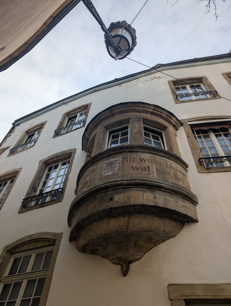Just down from Ënnert de Steiler, tucked away in a nondescript alleyway, is a building with an oriel bay window with an inscription.